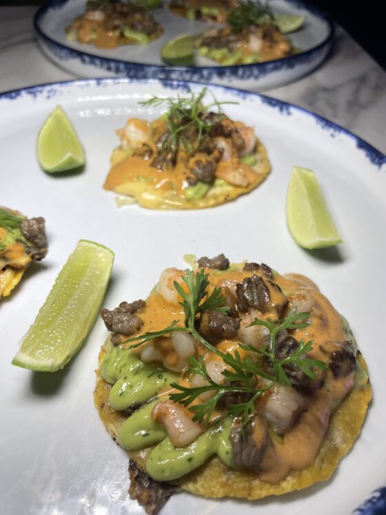 La base es una tortilla de maíz con costra de queso Colby Jack, dorada a la perfección para ofrecer un crujido delicado y un aroma que anuncia la intensidad del taco. En el corazón del platillo, el morrillo de res madurado a la parrillaaporta jugosidad, profundidad y un sabor ahumado que se equilibra con los camarones zarandeados, tiernos, con un toque de brasa que recuerda la frescura del mar.